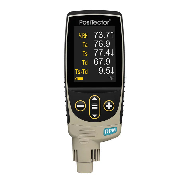With PosiTector Dew Point Meter, measurement of relative humidity, surface temperature, air temperature, dew point temperature, and difference between surface and dew point temperatures, is performed simultaneously with a single gauge, with no need to consult complex tables or use a dew point calculator. Read all measurement parameters easily on the large LCD display, store measurements internally in the gauge, download readings to your computer, or upload to DeFelsko’s cloud-based application, PosiSoft.net. PosiTector DPM can be set up to AutoLog at user-selected intervals for continuous monitoring of all measurement values.