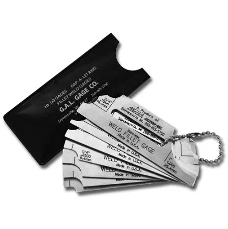 G.A.L. Gage 7-Piece Fillet Weld Gauge set measures throat fillet or leg fillet weld size. Made of stainless steel, gauges resist rust or bending. Fillet weld gauge sets are available with measurements marked on one or both sides of the gauges. Single sided gauges come standard with markings in inches with metric equivalents shown below. A metric scale version is also available. This Fillet Weld Gauge Set can be certified.