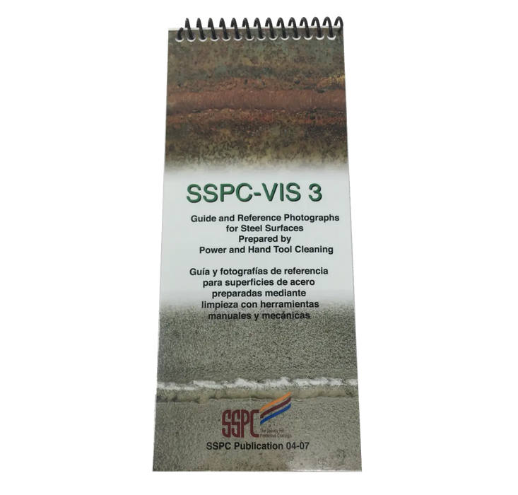 SSPC VIS 3 Visual Standard: Guide and Reference Photographs for Steel Surfaces Prepared by Hand and Power Tool Cleaning contains a series of 43 full-color reference photographs to be used as a supplement to the SSPC Standards for hand-and power-tool cleaned steel. VIS 3 shows a total of seven different steel surfaces (four uncoated and three previously coated) before and after hand tool cleaning (SP 2), power tool cleaning with power wire brushes and sanding discs (SP 3), power tool cleaning to bare metal (SP 11), and commercial grade power tool cleaning (SP 15).